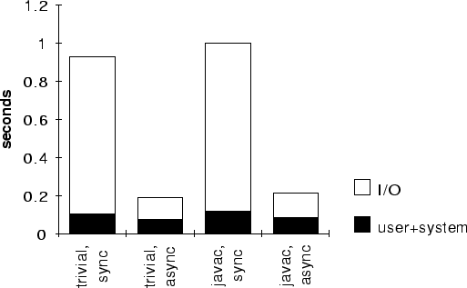 One component of Snowflake, our container mechanism Icee, can be directly measured. Figure [->] shows the performance of Icee checkpointing a trivial process (a class with an empty main method) and a process containing a Java compiler, with all of its attendant classes and data structures. In each case, we show the results of synchronously writing the process image to disk, and copying the image in memory. The maximum coefficient of variation was 0.08. The dominating factor is I/O latency, which is not surprising considering that even the trivial process has a five-megabyte image. Icee does not yet incorporate well-known optimizations, including incremental and asynchronous checkpointing.