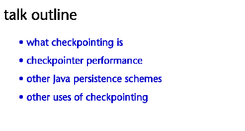 In this talk, I'll describe what checkpointing is, and how we do it in Icee. I examine the performance impact of checkpointing on the JVM. I'll categorize other Java persistence schemes presented at this workshop, and describe how Icee fits in among them. Finally, I'll give an overview of other things checkpointing is useful for. |