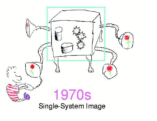 History, as we know, began on January 1, 1970. I'll roughly characterize the seventies as the era of the mainframe -- one big chunk of iron, with CPU (gears) and disk resources shared by many users, likely in many departments. This gave the system a single-system image, in the sense that no matter which terminal you sat in front of, or ``where'' in the system your programs ran, you saw a uniform view of the resources in the system.
