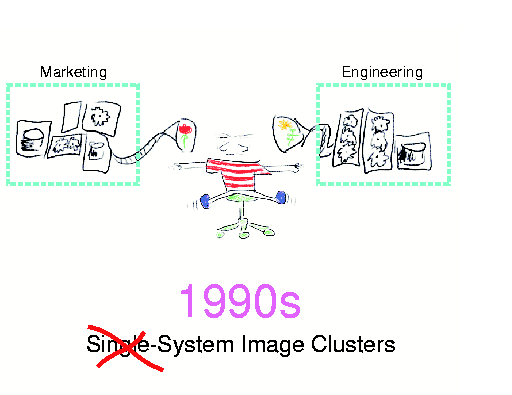 There was a problem with this strategy, however. Unlike the seventies, when perhaps one or two departments in an organization could afford a mainframe, clusters were cheap, and so they popped up all over the place; one might find multiple clusters within a department. It's not uncommon that users find they need to access resources from different administrative domains (that is, clusters) -- in this scenario, each cluster has its own system image, defeating the purpose of the single-system image.